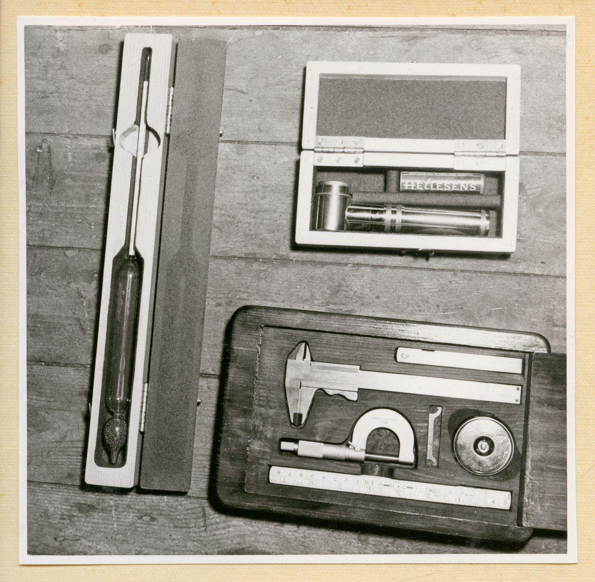 Maskinuppb. Lådor för aerometer (vatten) lup. "soloclar" och metermått, mokromet, metermått, (stålband), skjutmått och slitmått.