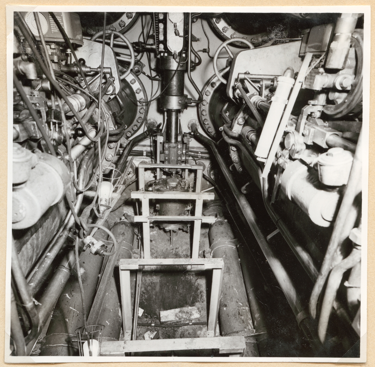 Torpedrum. Utrymmet under durk mellan torpedtuberna, sett akterifrån.