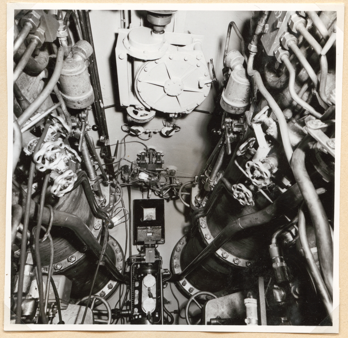 Torpedrum. Taket mellan torpedtubernasett akterifrån.