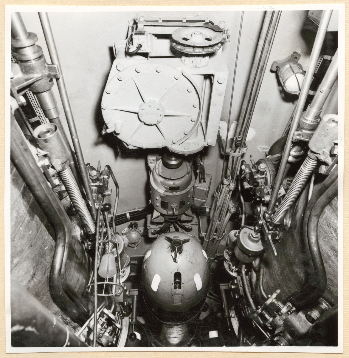 Torpedrum. Taket mellan torp.tuberna sett förifrån. Förhalningsspelet.