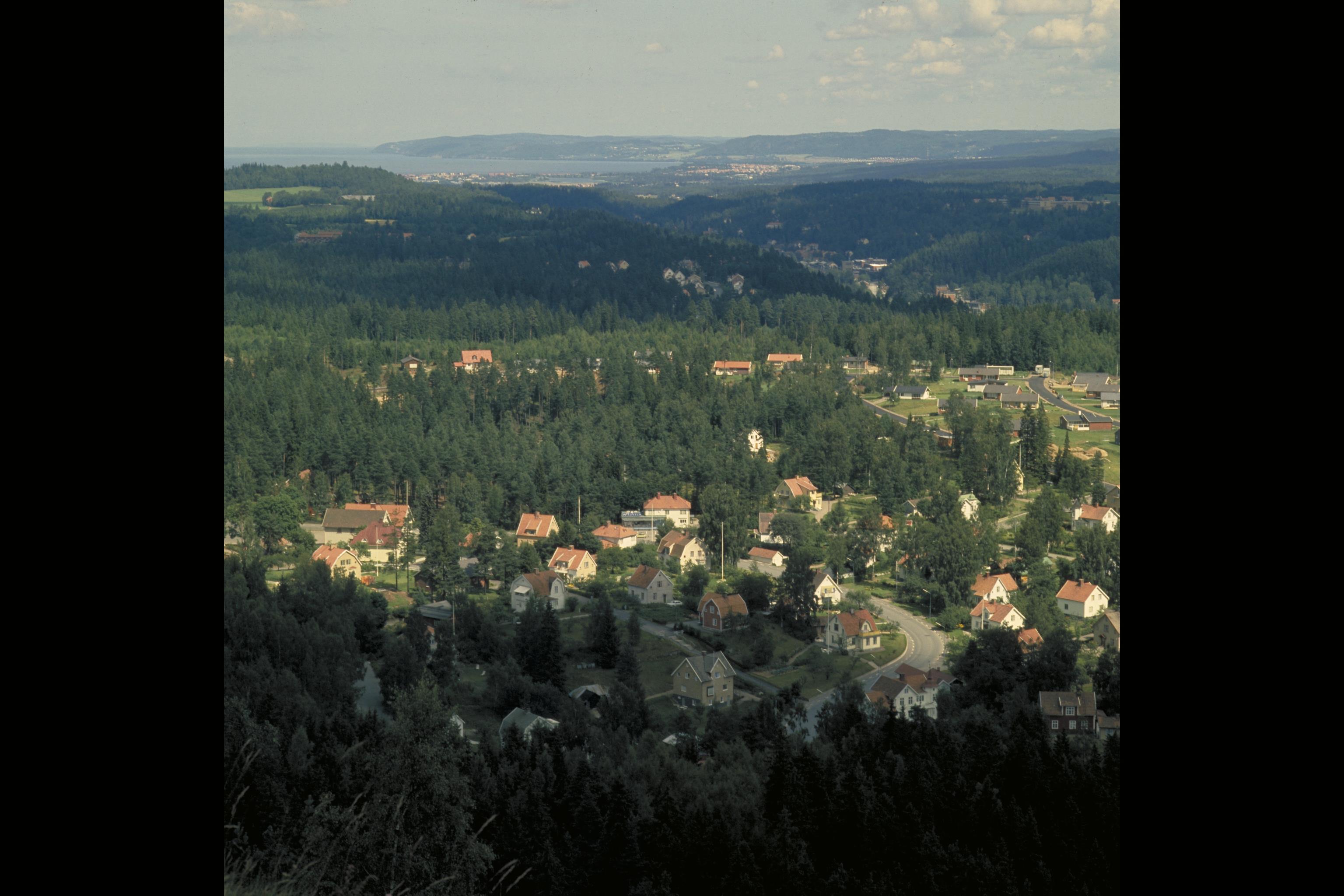 Vu över skogslandskap och bebyggelse. Bilden troligen från slutet av 1960-talet.