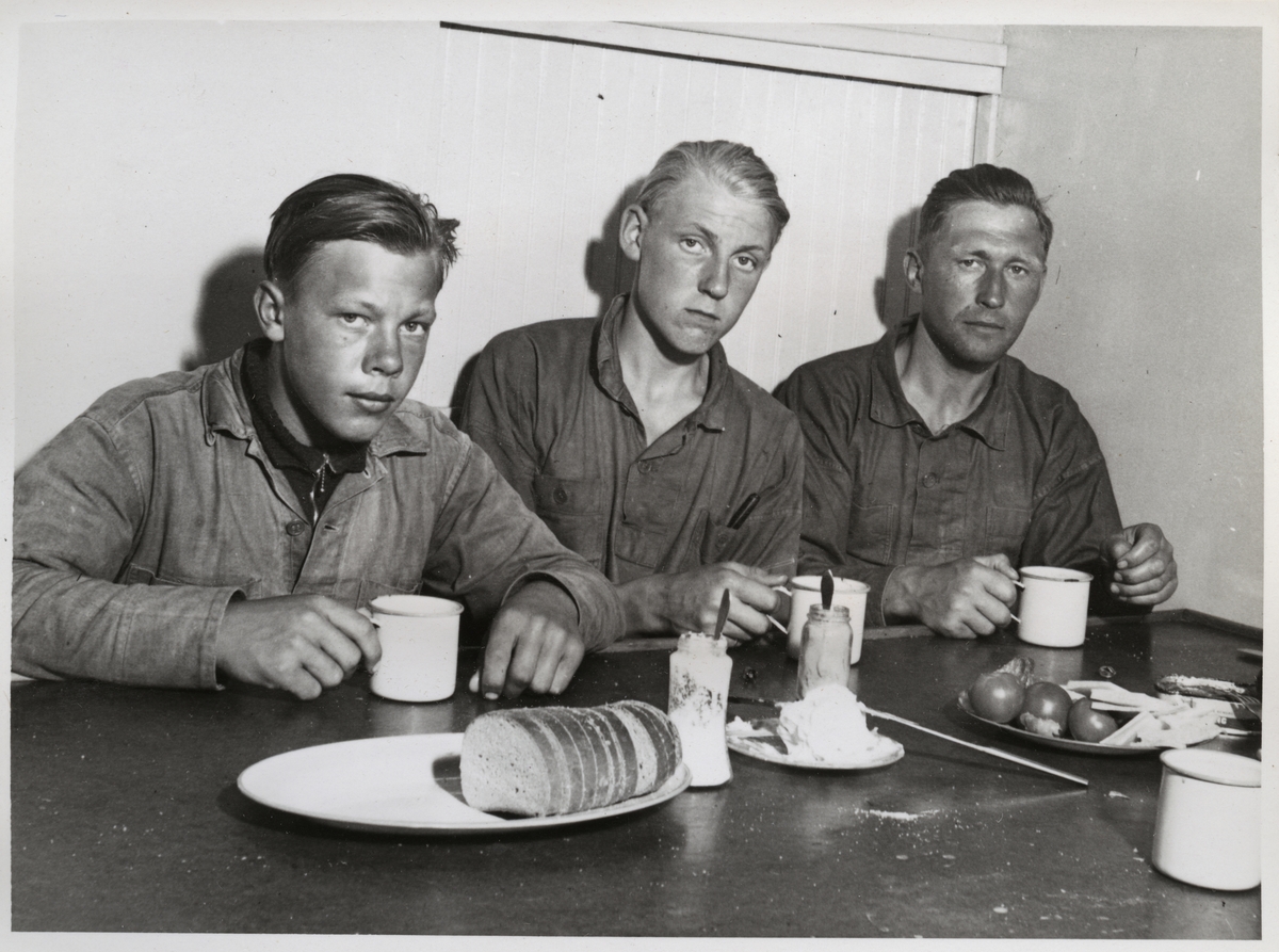 Titel: 3 män vid frukostbordet.
