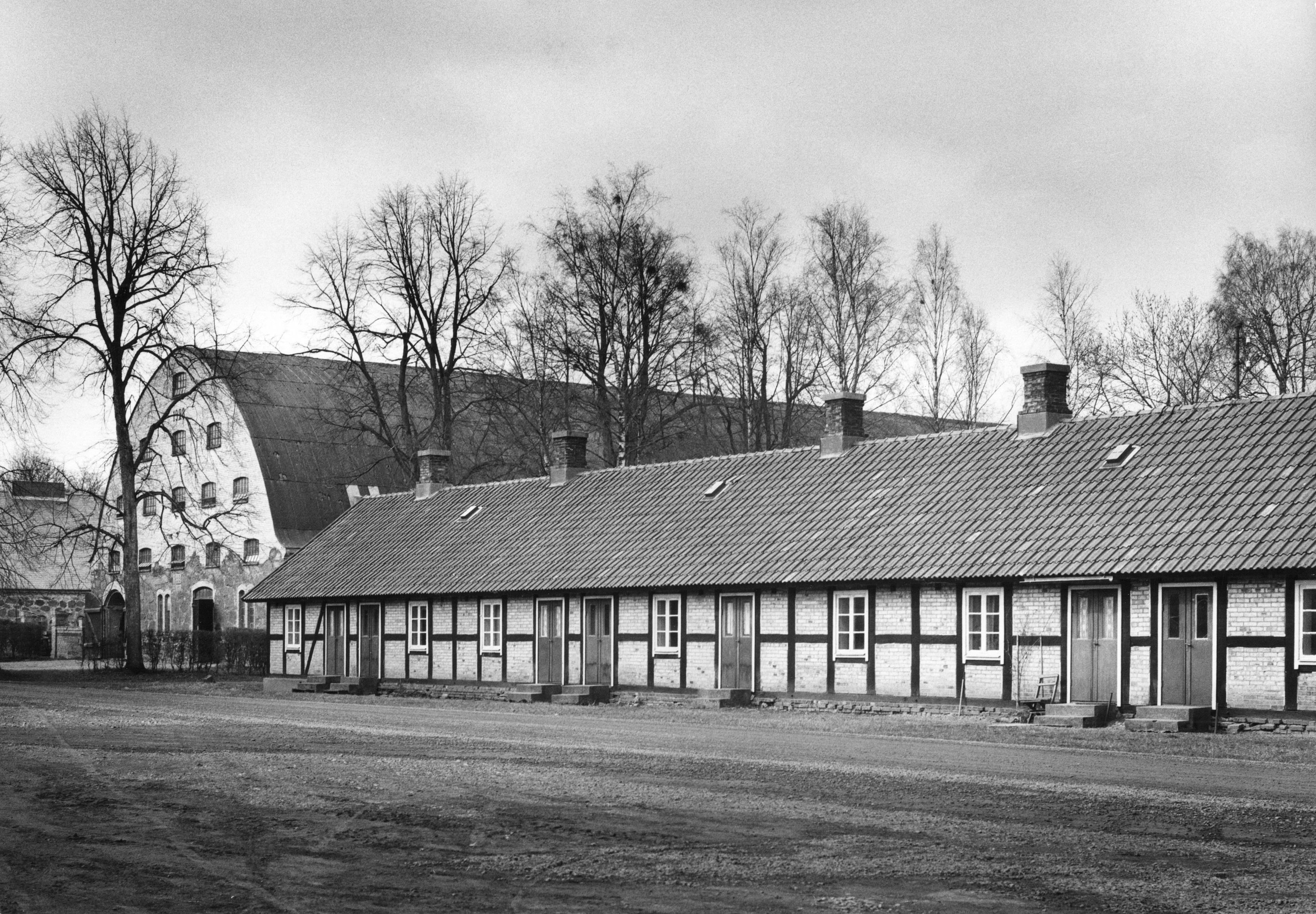 Rögle säteri/gård, logbyggnaden i bakgrunden. Bilden troligen från omkring 1960.