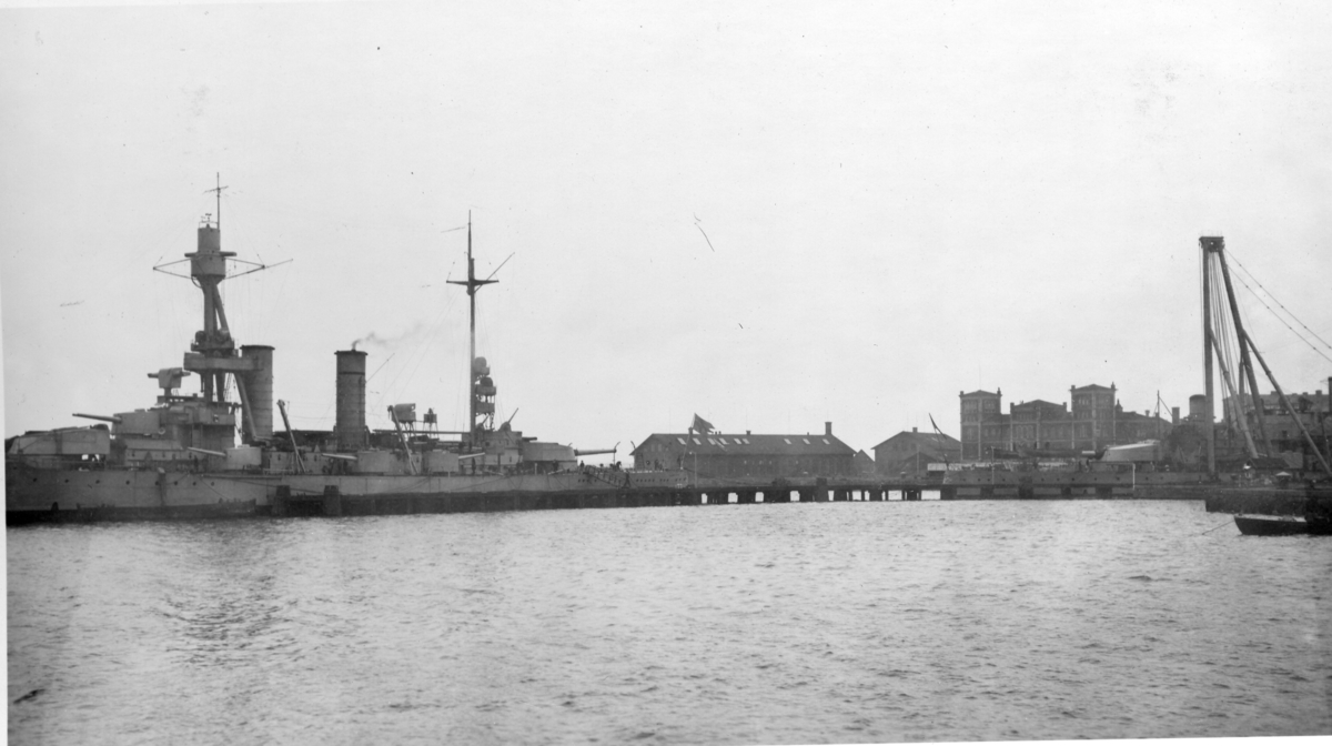 Pansarskeppet Drottning Viktoria vid utrustningspiren Pansarskeppet Gustav V i bakgrunden.