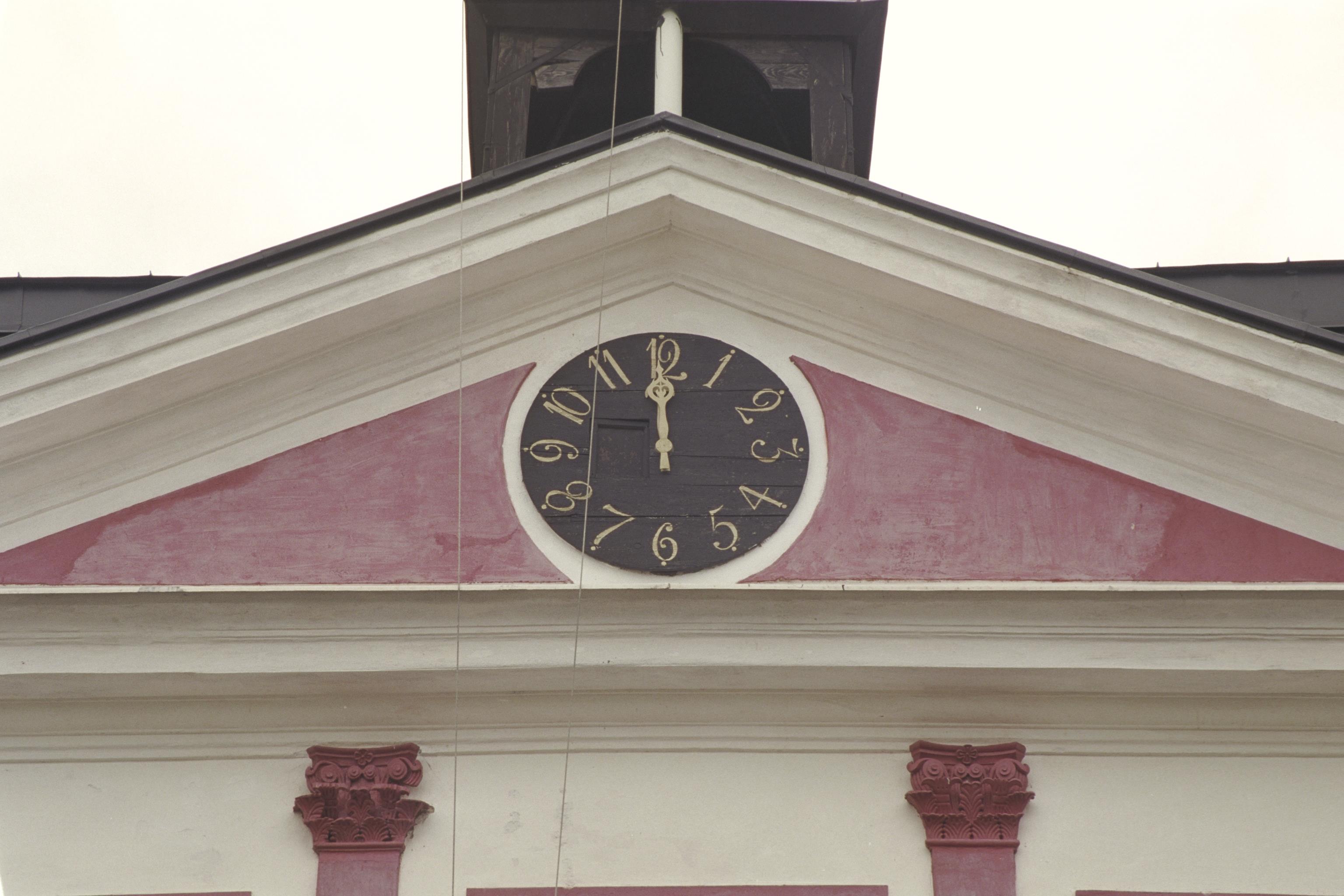 Huvudbyggnadens västra fasad, mittrisalitens fronton.