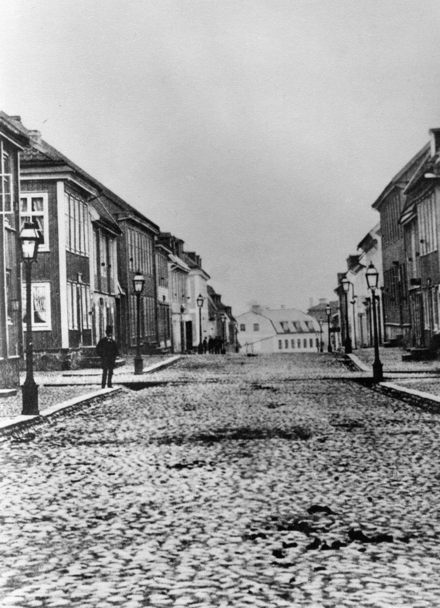 Ronnebygatan från öster 1867 i bakgrunden det Bergqvista huset vid Borgmästaregatan.