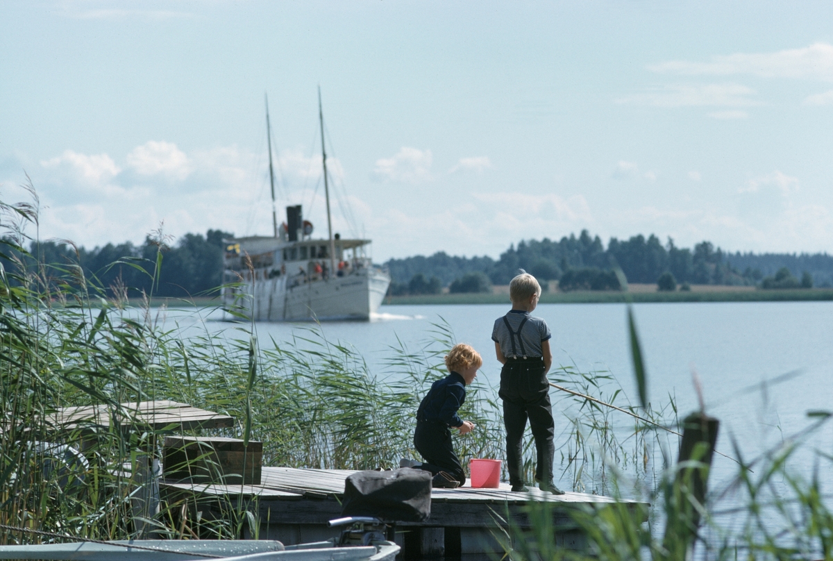 Ett par barn på bryggan och en suddig Motala Express i bakgrunden.