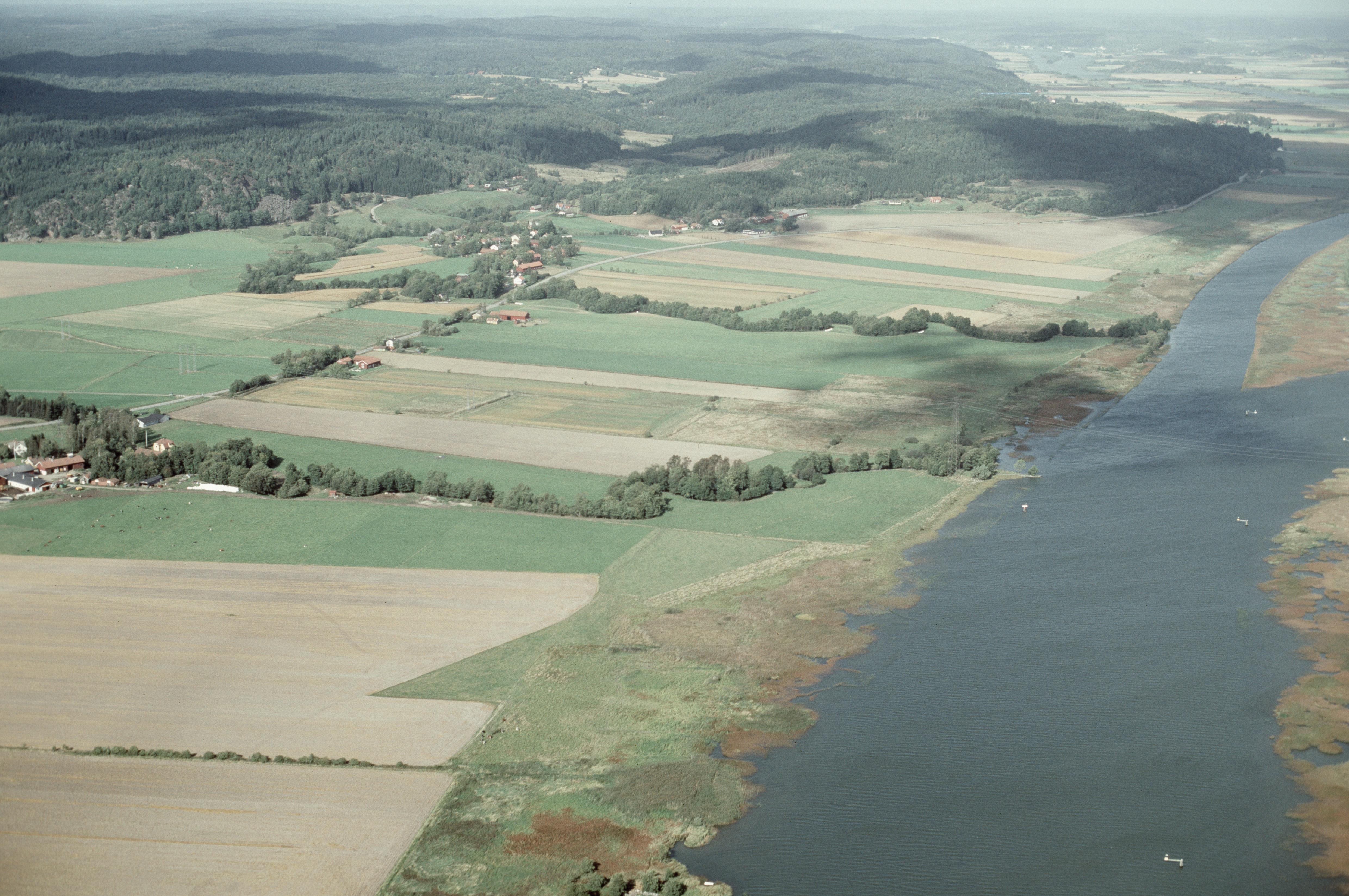 Solbergsåns utlopp i Göta älv. Bytomt RAÄnr Romelanda 159:1 i Solbergs by till vänster bildens övre del. Bilden är tagen mot (väderstreck): NNO