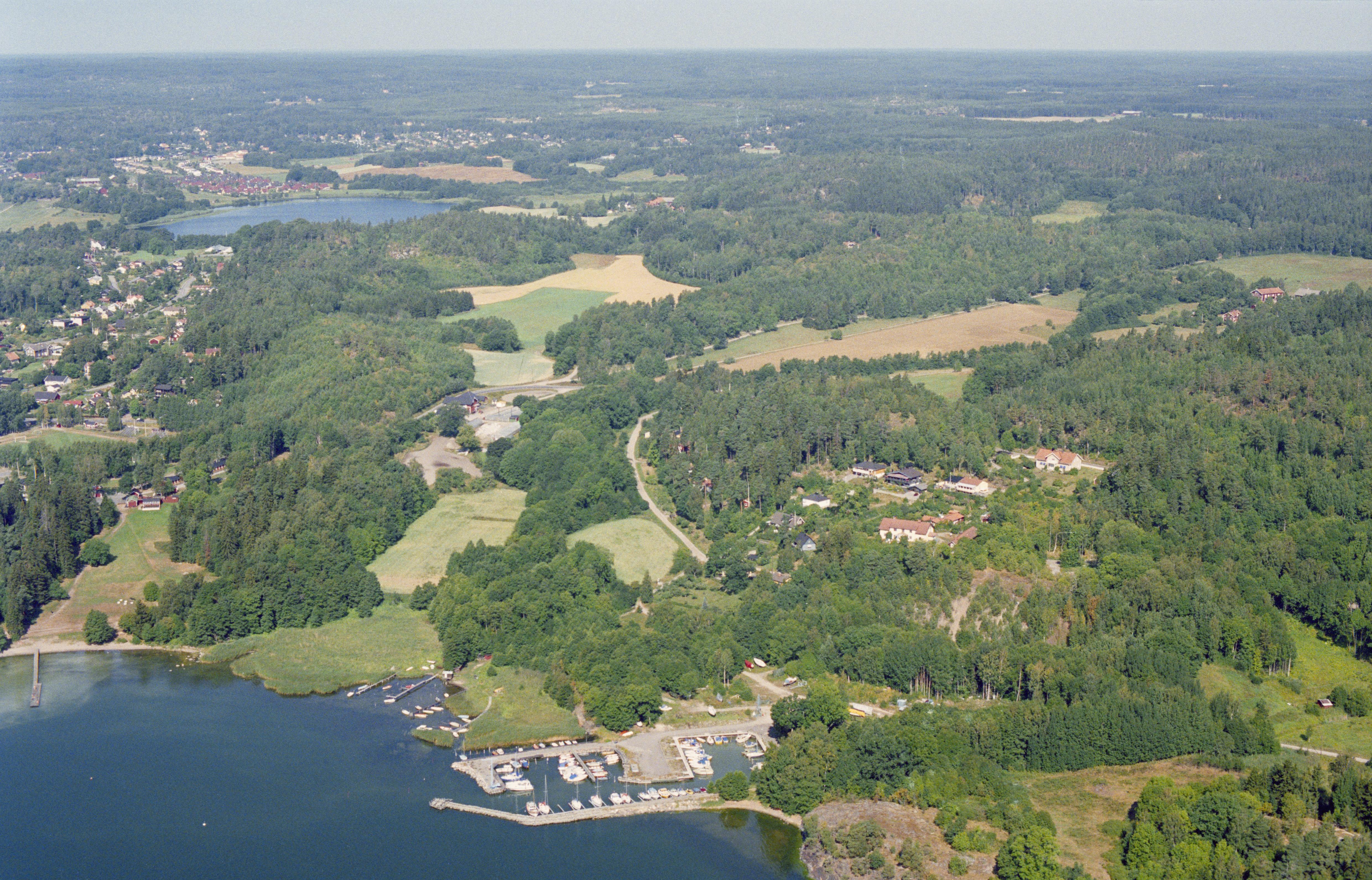Bodaviken i Bråviken. Östra delen av tätorten Nere till vänster boplats RAÄnr Krokek 1:1 m.fl. vid Fagervik och Marmorbruket. I bildens övre del Kolmården. Bilden är tagen mot (väderstreck): NV