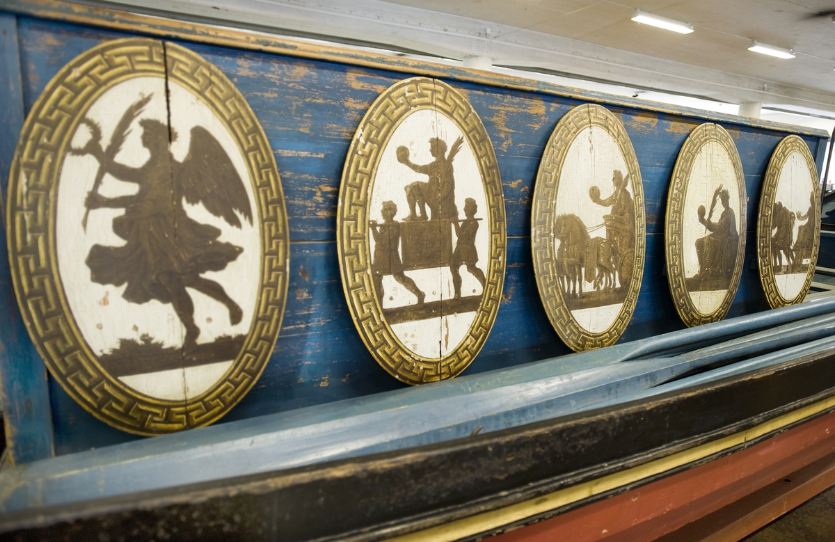 Sköldar med antika motiv på sidan av salsslupen DELFINEN.