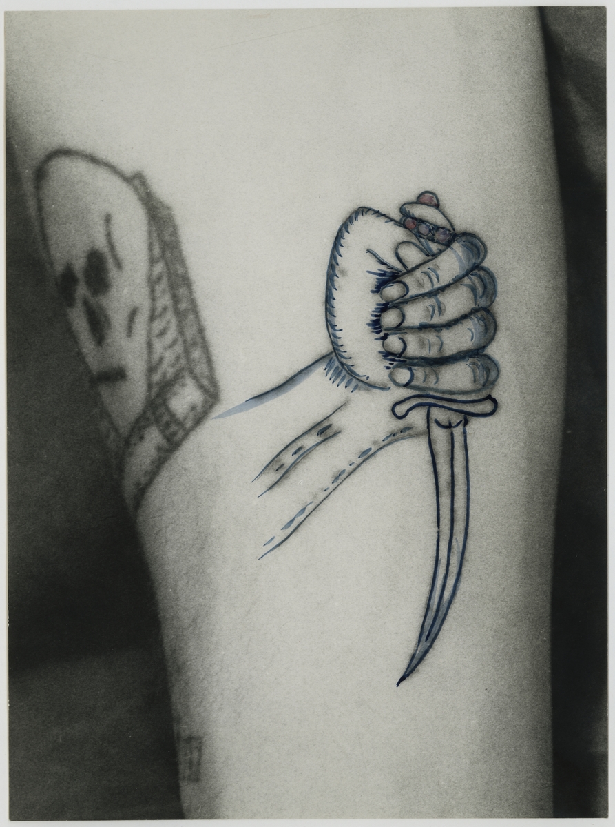Titel: Tatueringbild. Matrosen Bror Larsson. Höger arms insida, Handstucket arbete, utförd i Göteborg 1918-1920.