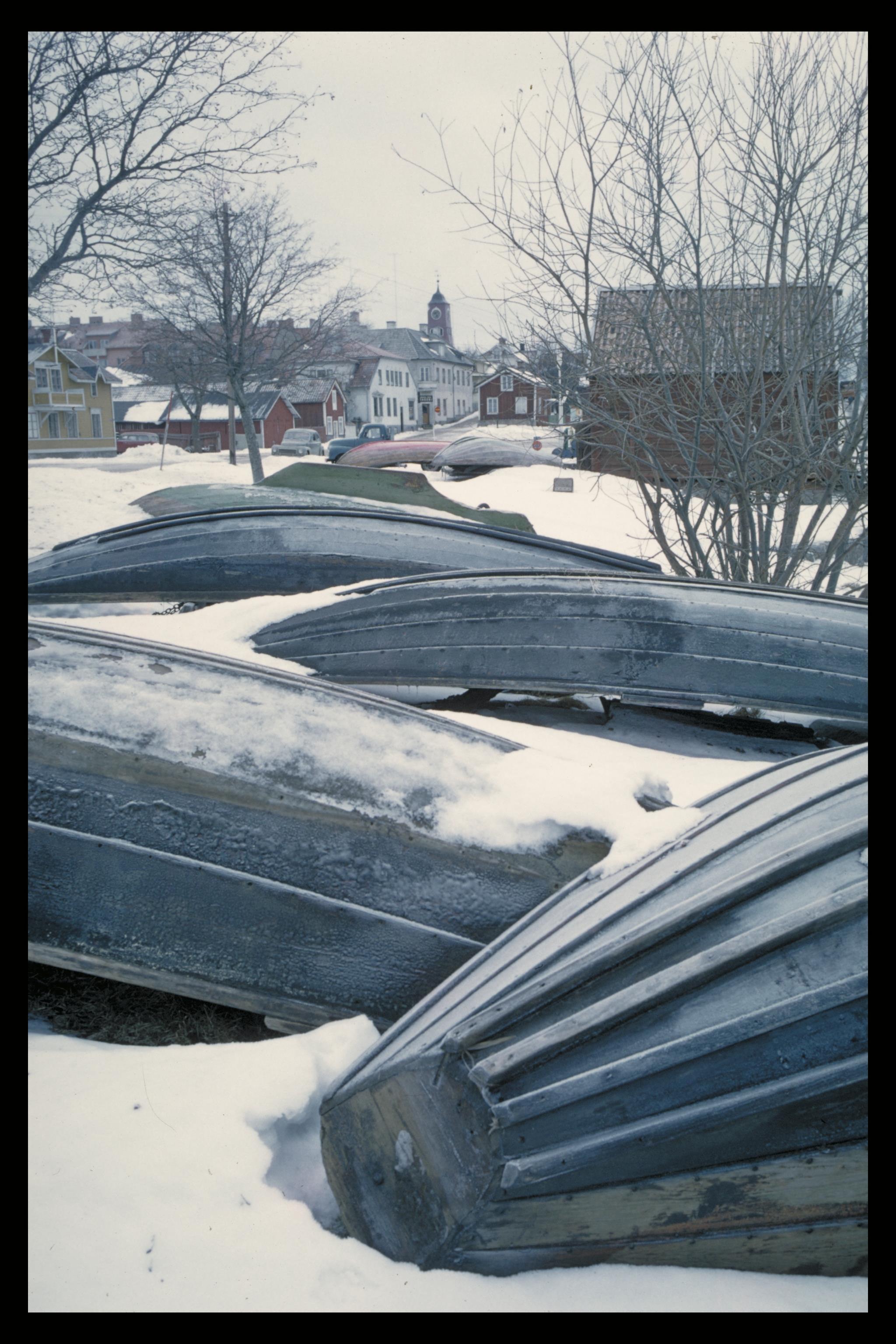 Båtar på land, staden i bakgrunden. Bilden troligen från början av 1960-talet.