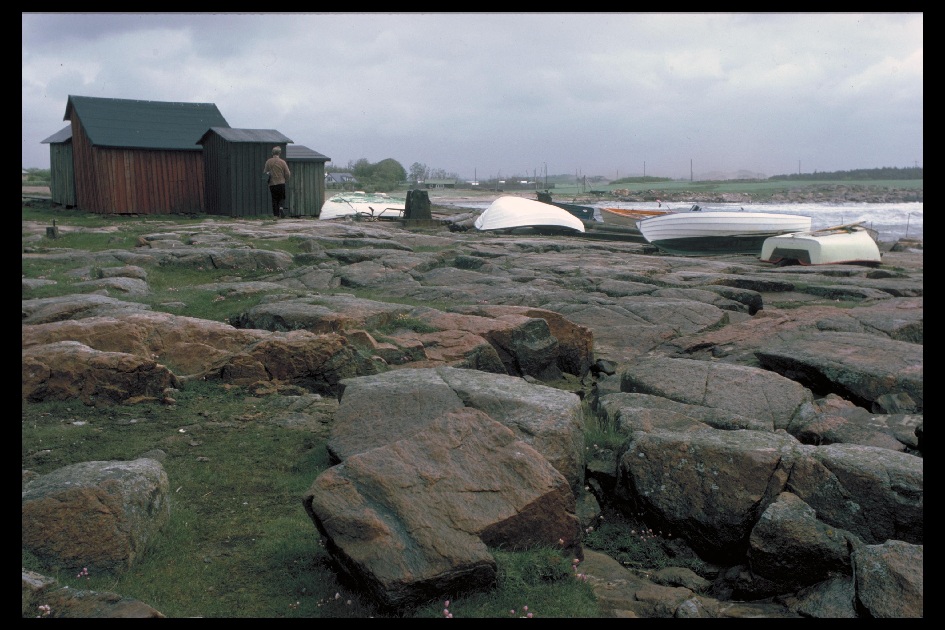 Uppdragna båtar vid kusten. Bilden troligen från mitten av 1970-talet.