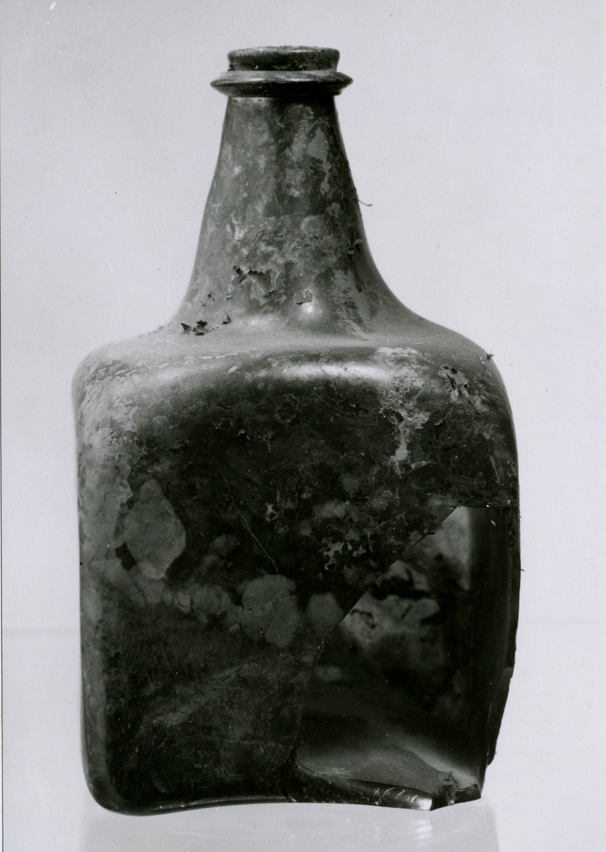 Fyrkantig flaska, grönt glas, låg kulle i botten. Ett hörn av väggen avslaget.