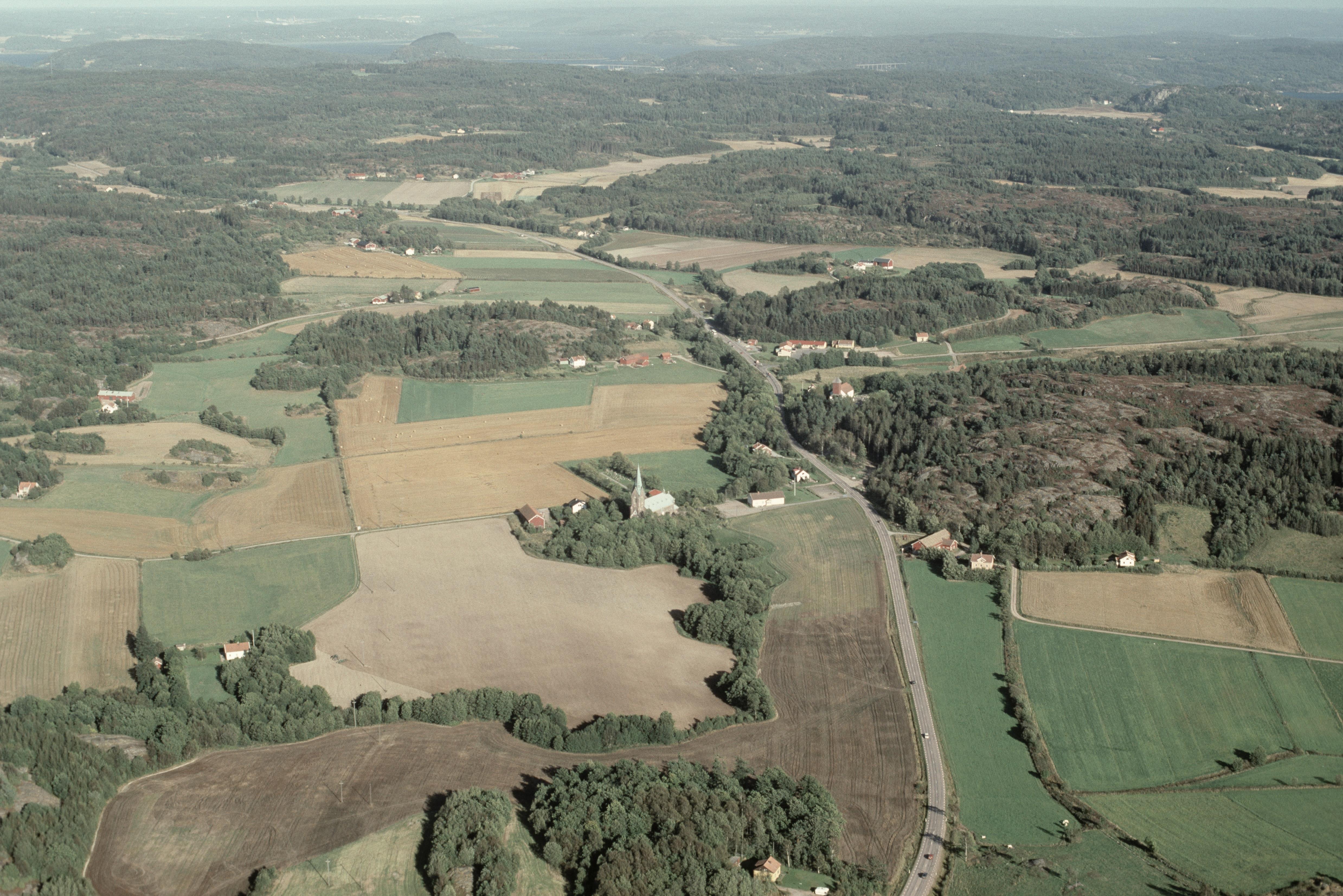 Bokenäs nya kyrka till vänster, Bokenäs gamla kyrka till höger. Fornlämningar (bl.a. en boplats) RAÄnr Bokenäs 217:1 och 218:1. Bilden är tagen mot (väderstreck): Ö