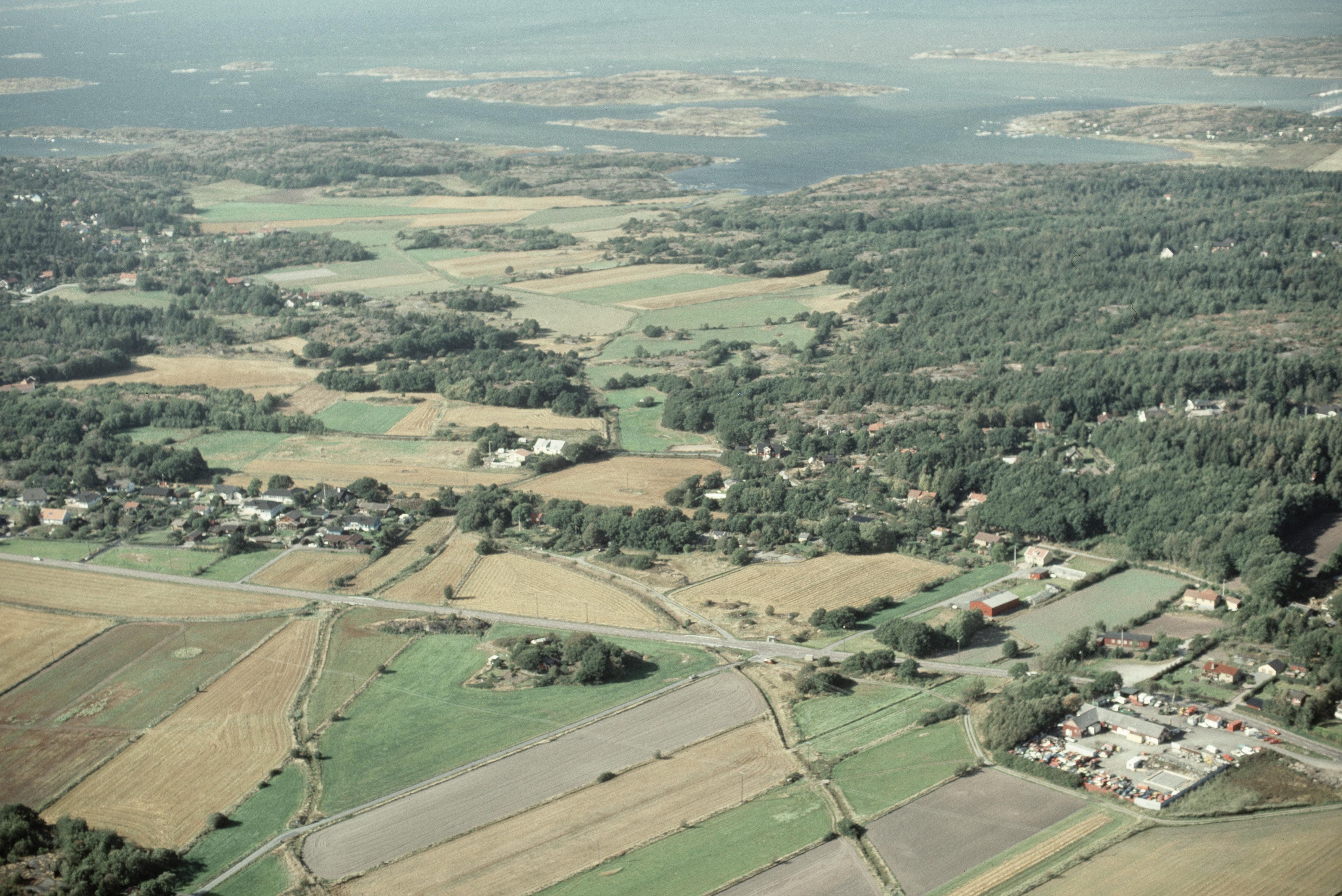 Låssbybäcks dalgång. Bremsegården med stensättning RAÄnr Björlanda 16:1 vid bildens mitt. I bildens övre del StoraHästholmen i Prästgårdskilen. Bilden är tagen mot (väderstreck): NV