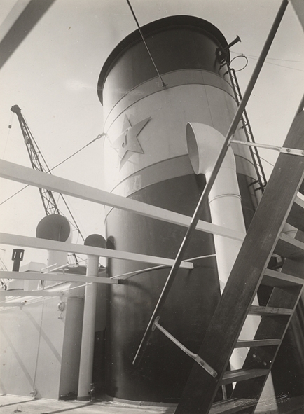 Båtdäck osch skorsten sedda från styrbords sida.