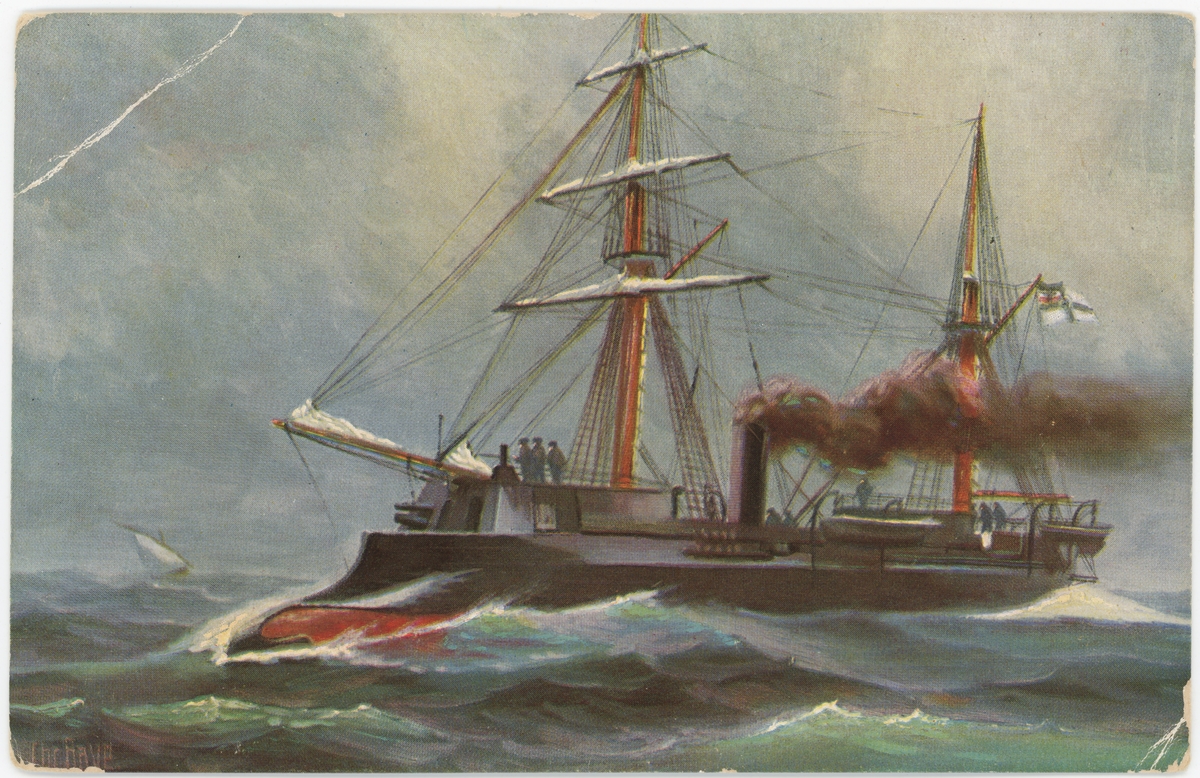 Tryckt holländskt vykort av målning av det tyska örlogsfartyget PRINZ ADALBERT (1864)