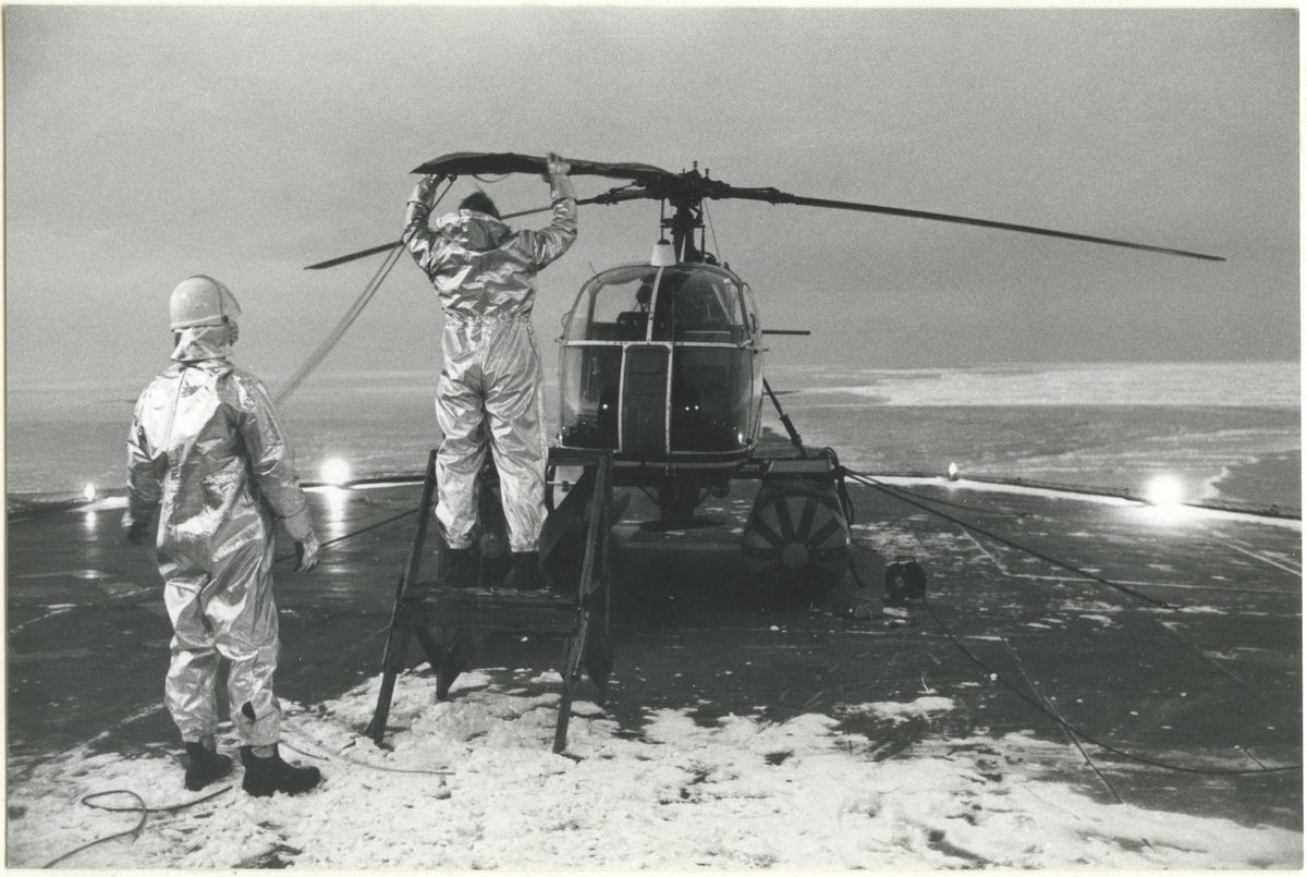 [från fotobeskrivningen:] "Helikopter ombord på statsisbrytaren Frej"; [under Fotograf:] "SSHM 1982"