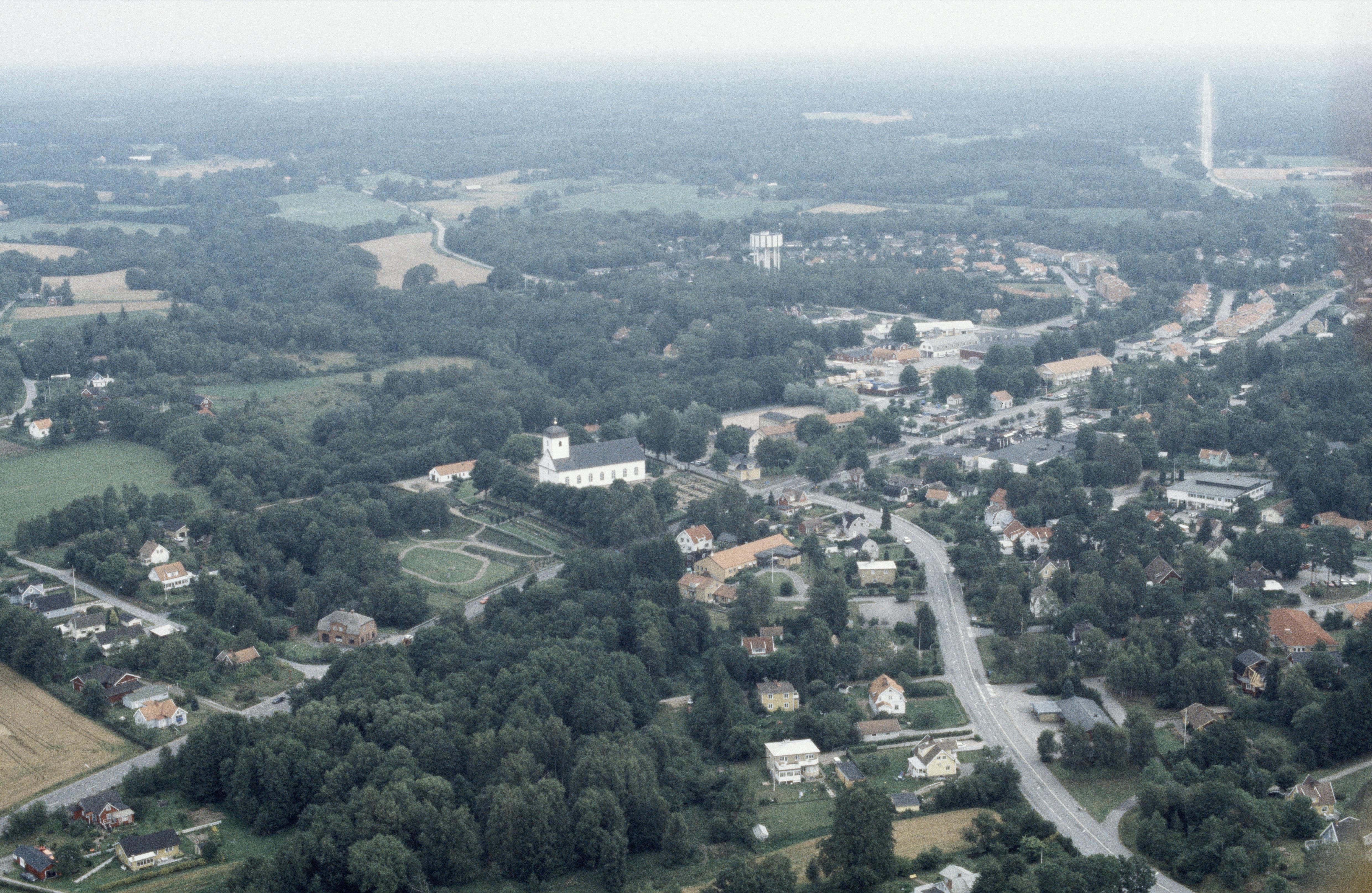 Jämjö tätort. Jämjö kyrka vid bildens mitt. Bilden är tagen mot (väderstreck): NO