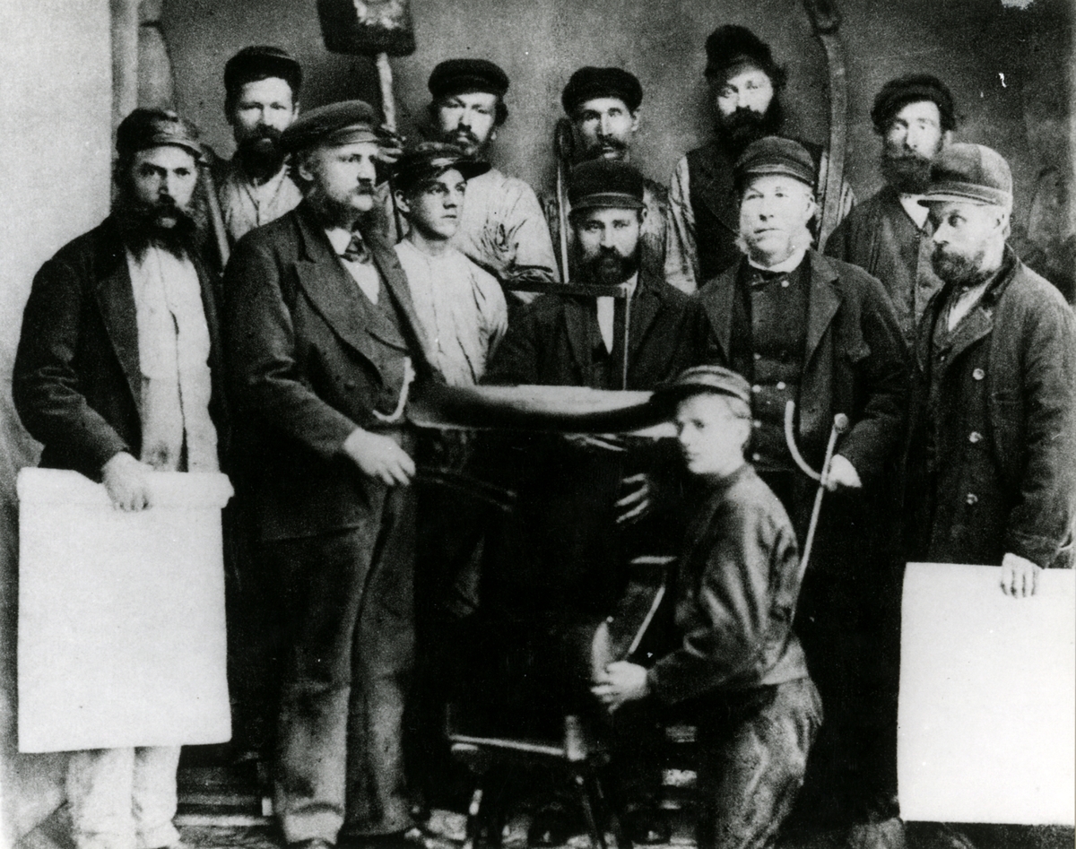 Skeppsbyggare på Bergsunds Mekaniska Verkstad, Stockholm, år 1886. På bilden syns mäster Jonsson och hans stab för fartygsbygge.