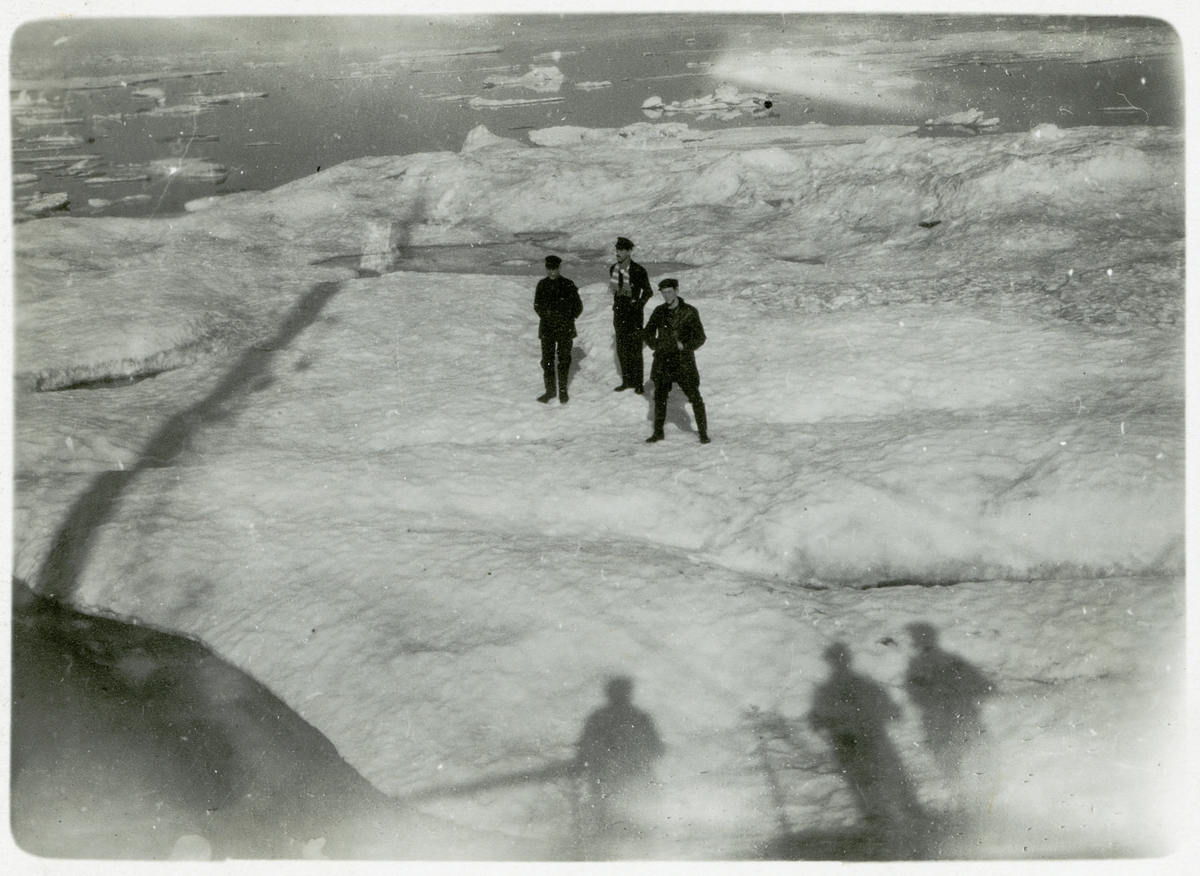 Besättningsmedlemmar som står på ett isflak i Karahavet framför S.S. Halvar. 1919.