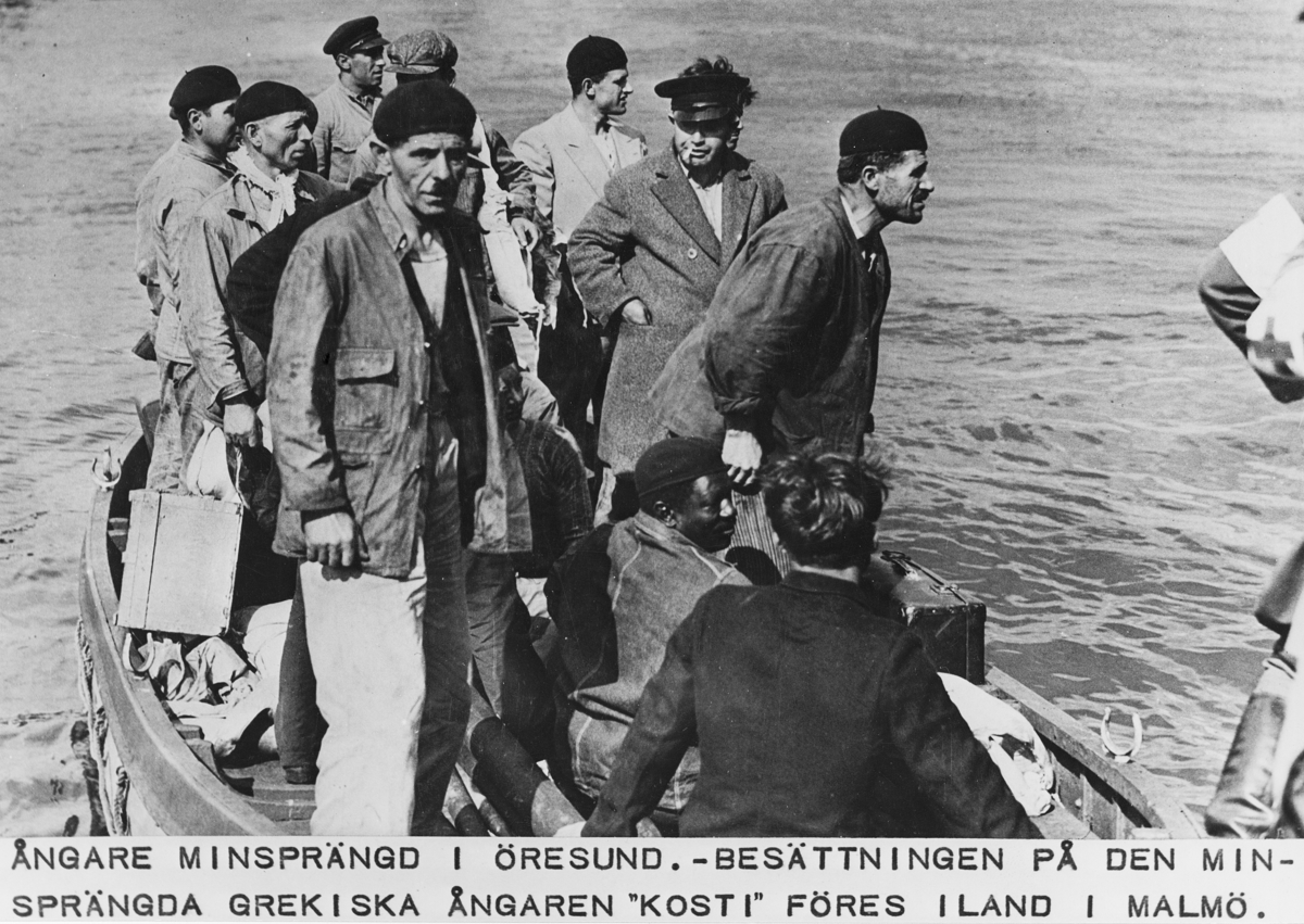 Ångare minsprängd i Öresund. Besättningen på den minsprängda grekiska ångaren Kosti föres i land i Malmö.