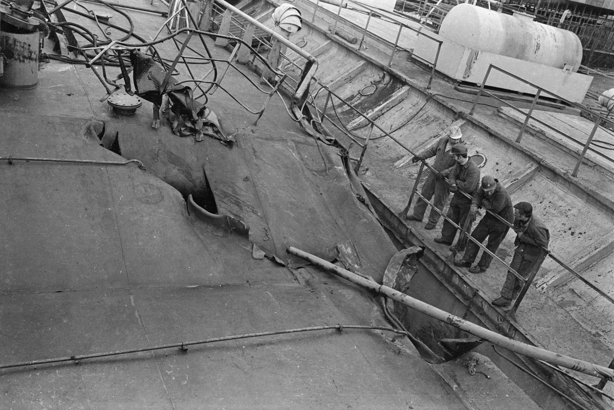 Ekensbergs varv 1970; varvsarbetare inspekterar skador på oidentifierat fartyg.