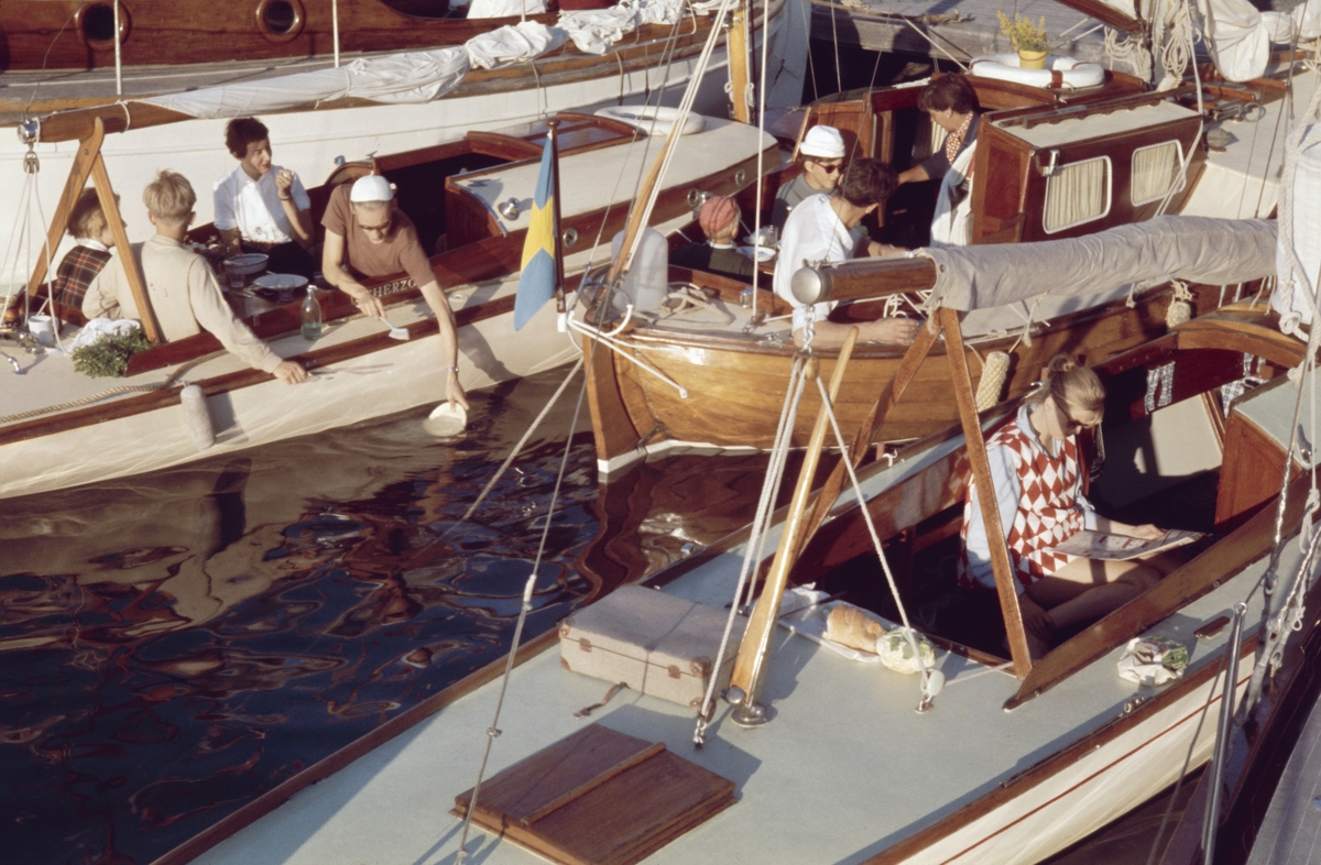 Seglebåtar ligger förtöjda och seglarna äter middag, umgås och läser.