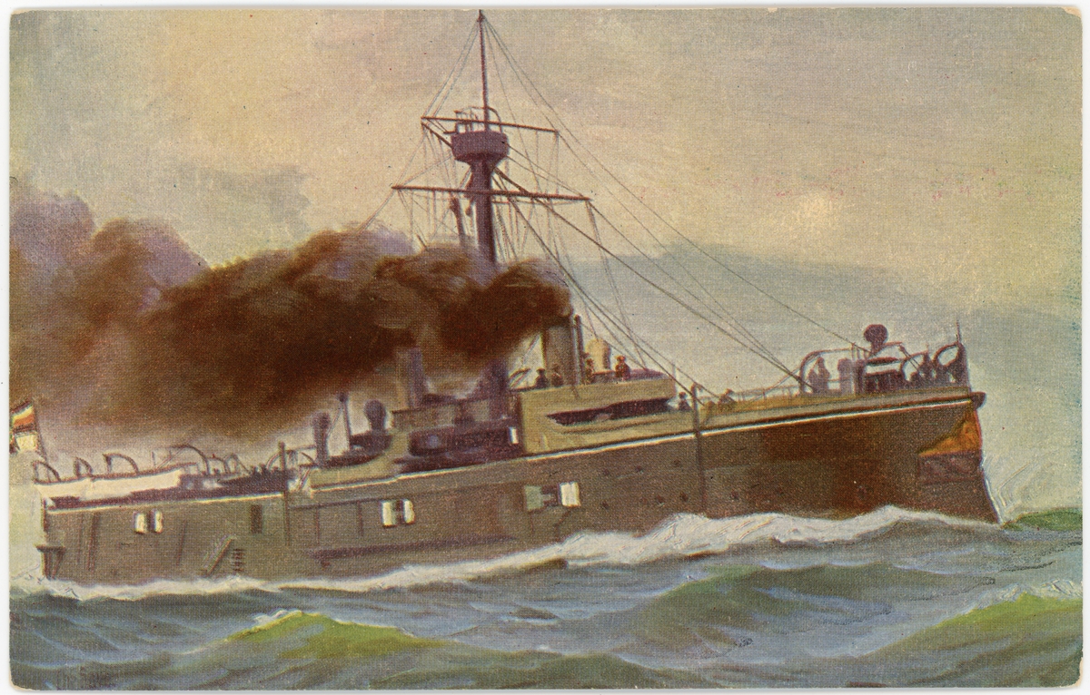 Tryckt holländskt vykort av målning av det tyska pansarskeppet OLDENBURG (1884)