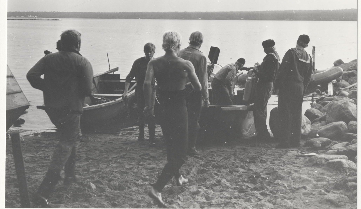 Dykutrustning och övrigt materiel lastas ur innan båtarna drages upp på land efter dagens dykningar.