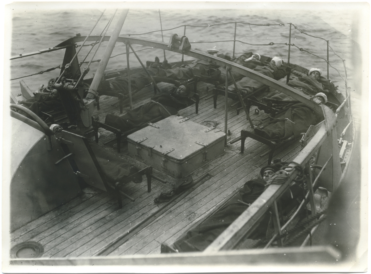 Matroser fastspända på britsar på däck på mindre fartyg, sannolikt under sjukvårdsövning (jfr Fo229285, Fo229289A och Fo229290A).