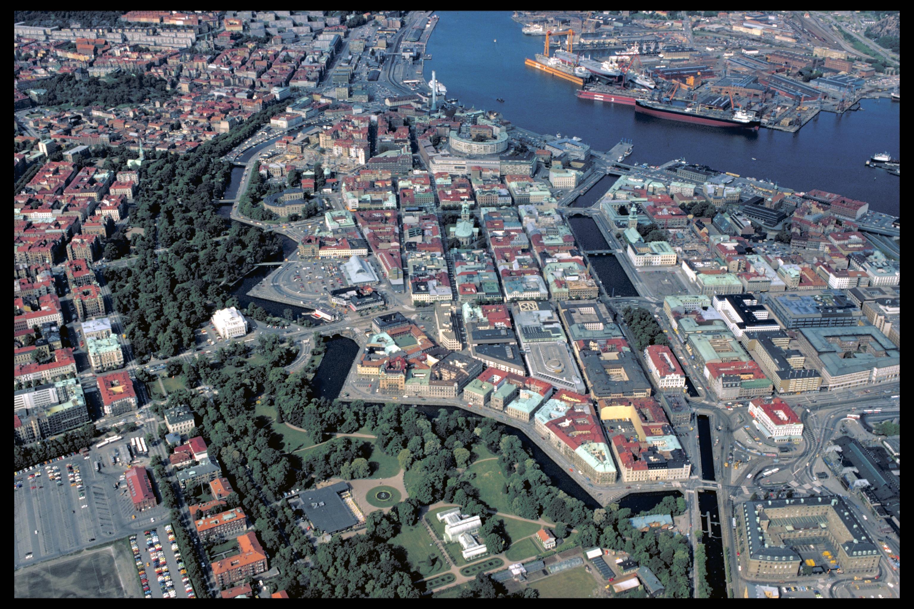 Centrala delen av Göteborg med stadsdelen Inom Vallgraven i bildens mitt. Mitt i stadsdelen ligger Göteborgs domkyrka, Gustavi domkyrka. Bilden troligen från slutet av 1970-talet.
