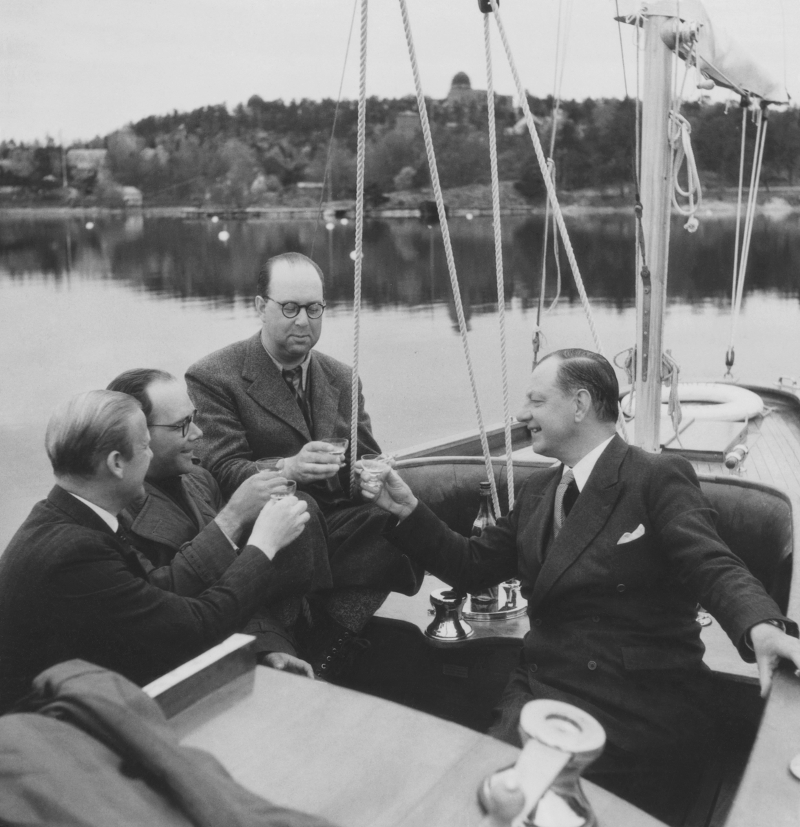 Gösta Åhlén tredje personen från vänster, Roy Hähnel längst till höger i segelbåt med en flaska konjak.
