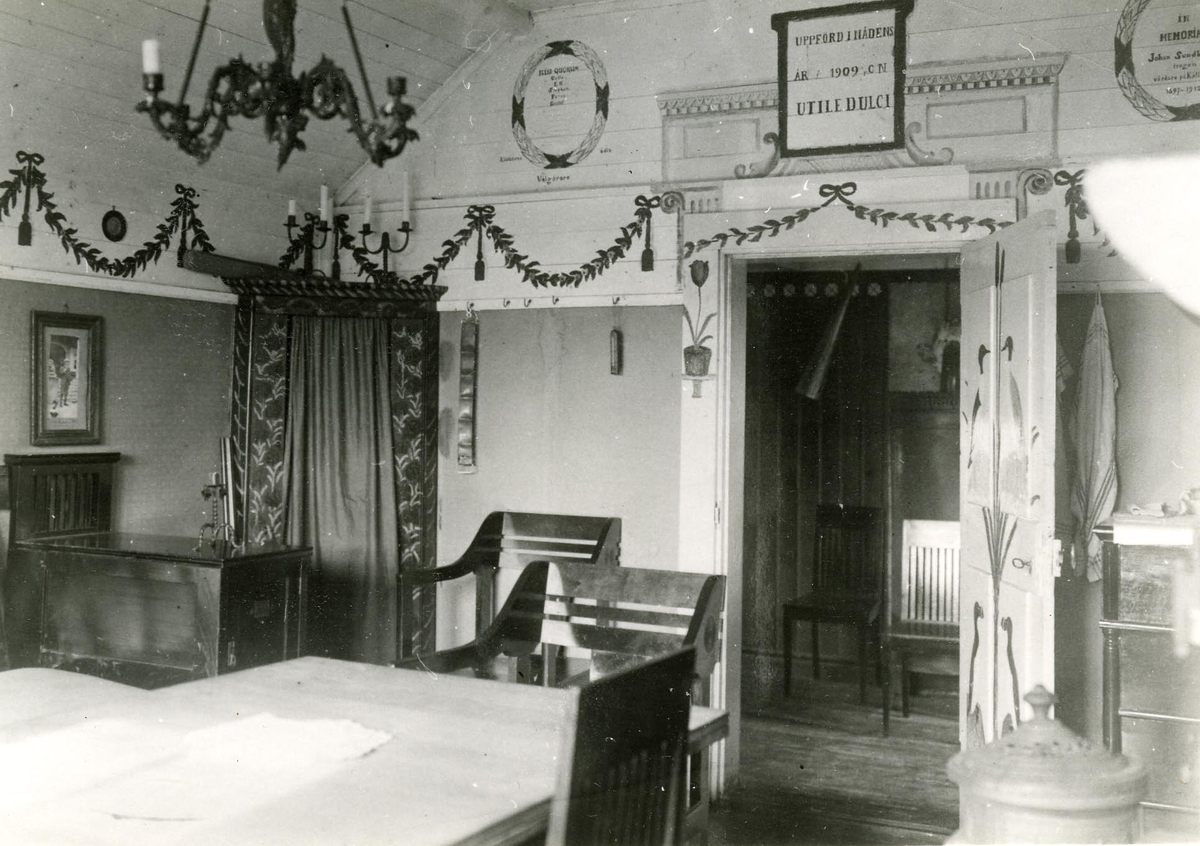Interiör av jaktstuga å Källskären, Nikolai. Nyköpingskungen Otto Lindeberg, direktör för bryggeriet, var initiativtagare till den.