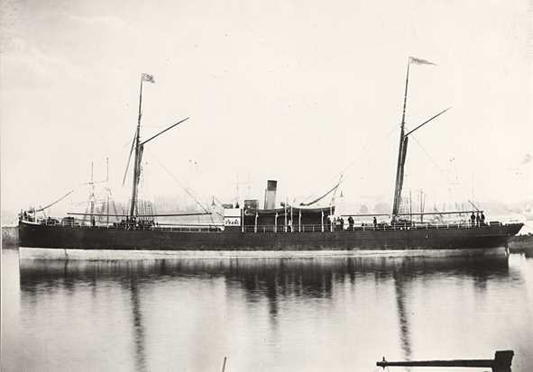 Foto i svartvitt visande lastångfartyget "FRANZ" av Kiel, på Stockholms ström, omkring 1900-talet.