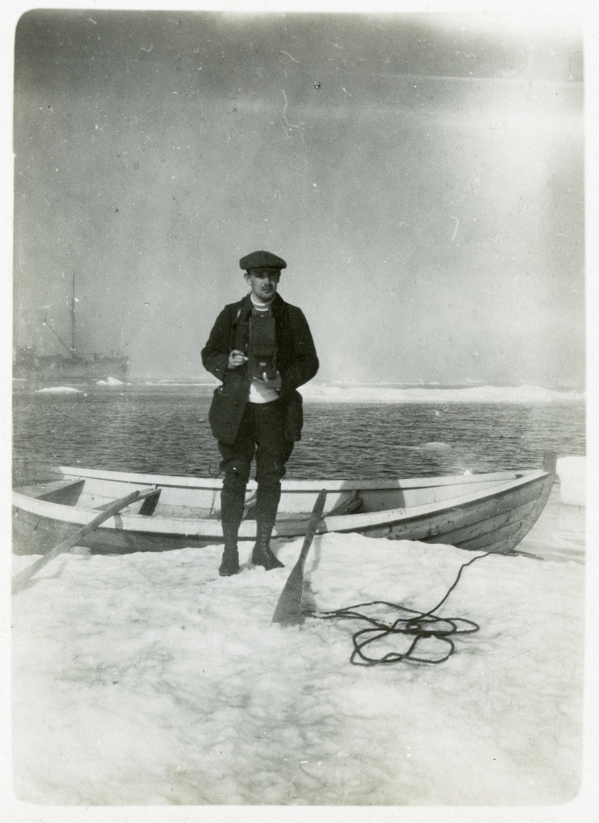 En fotograf på ett isflak i Karahavet. I bakgrunden syns Halvar. 1919.