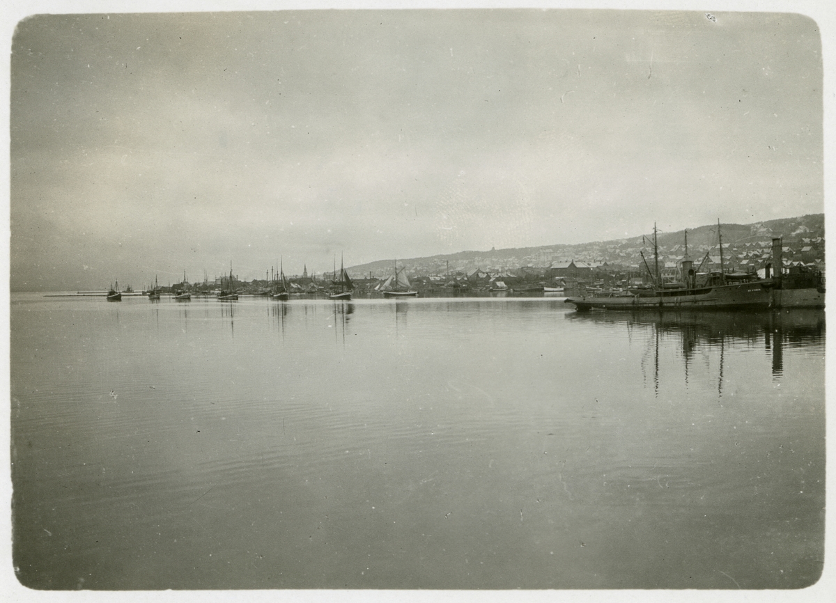 Förmodligen en kuststräcka i Norge i närheten av Tromsö. Det första ångfartyget till höger bär namnet St Cyrus.