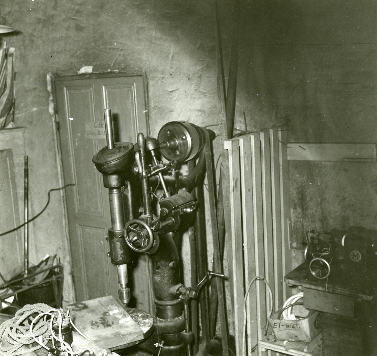Borrmaskin i mekaniska verkstaden. Borrmaskinen troligen från 1920 talet. Drivs med transmission.
