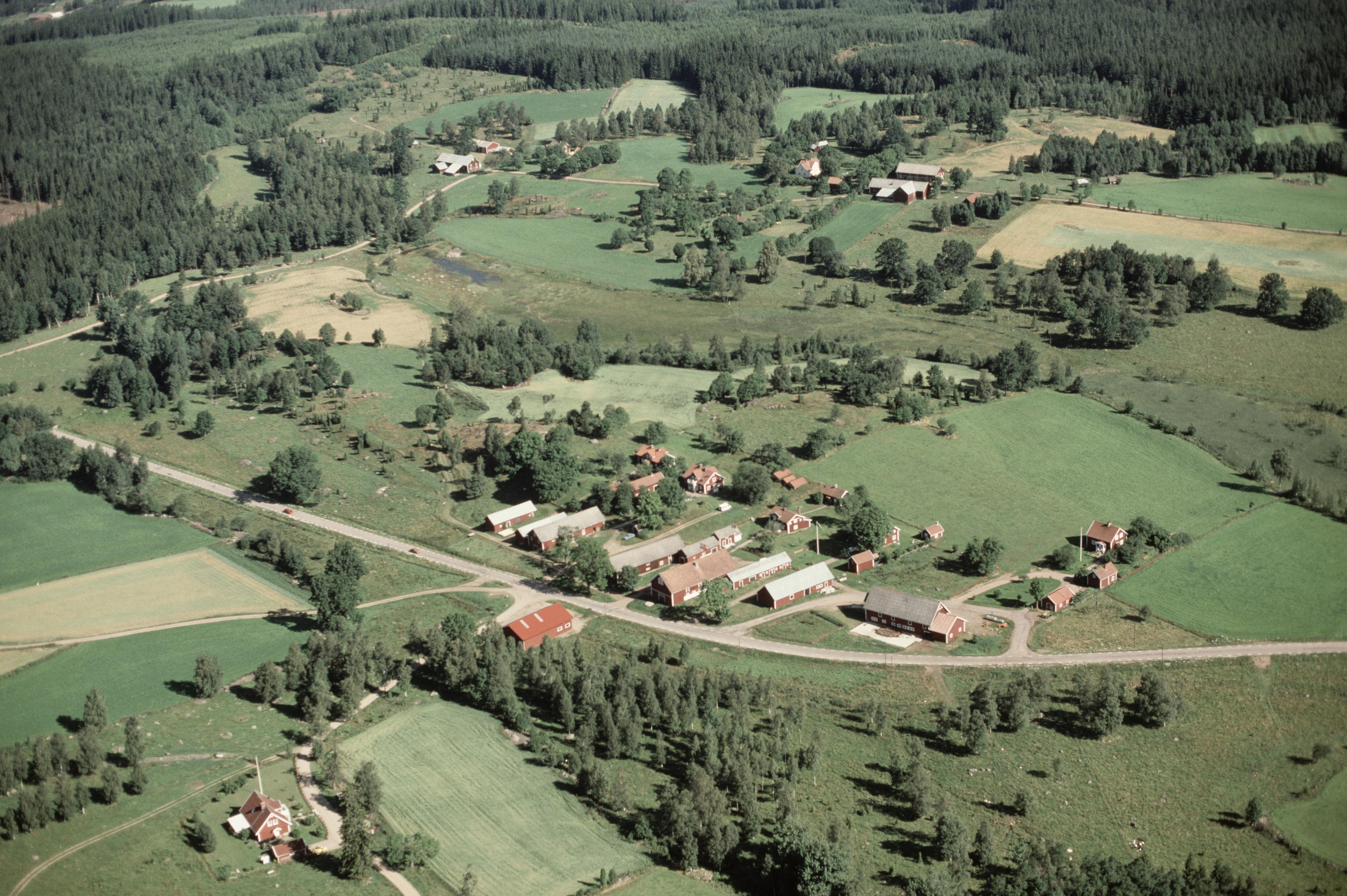 Grindsbo by vid bildens mitt, uppe till höger Sprängsbo. Vägmärke RAÄnr Svinhult 105:1 vid vägen. Bilden är tagen mot (väderstreck): NNV