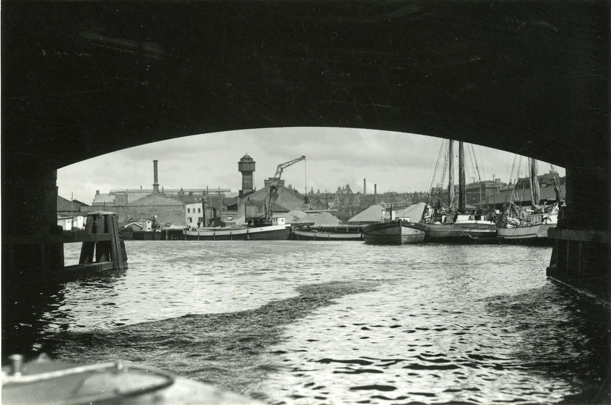 Sett från sjösidan under Stadshusbron, div. pråmar och skutor vid kajen i Klaraviken.