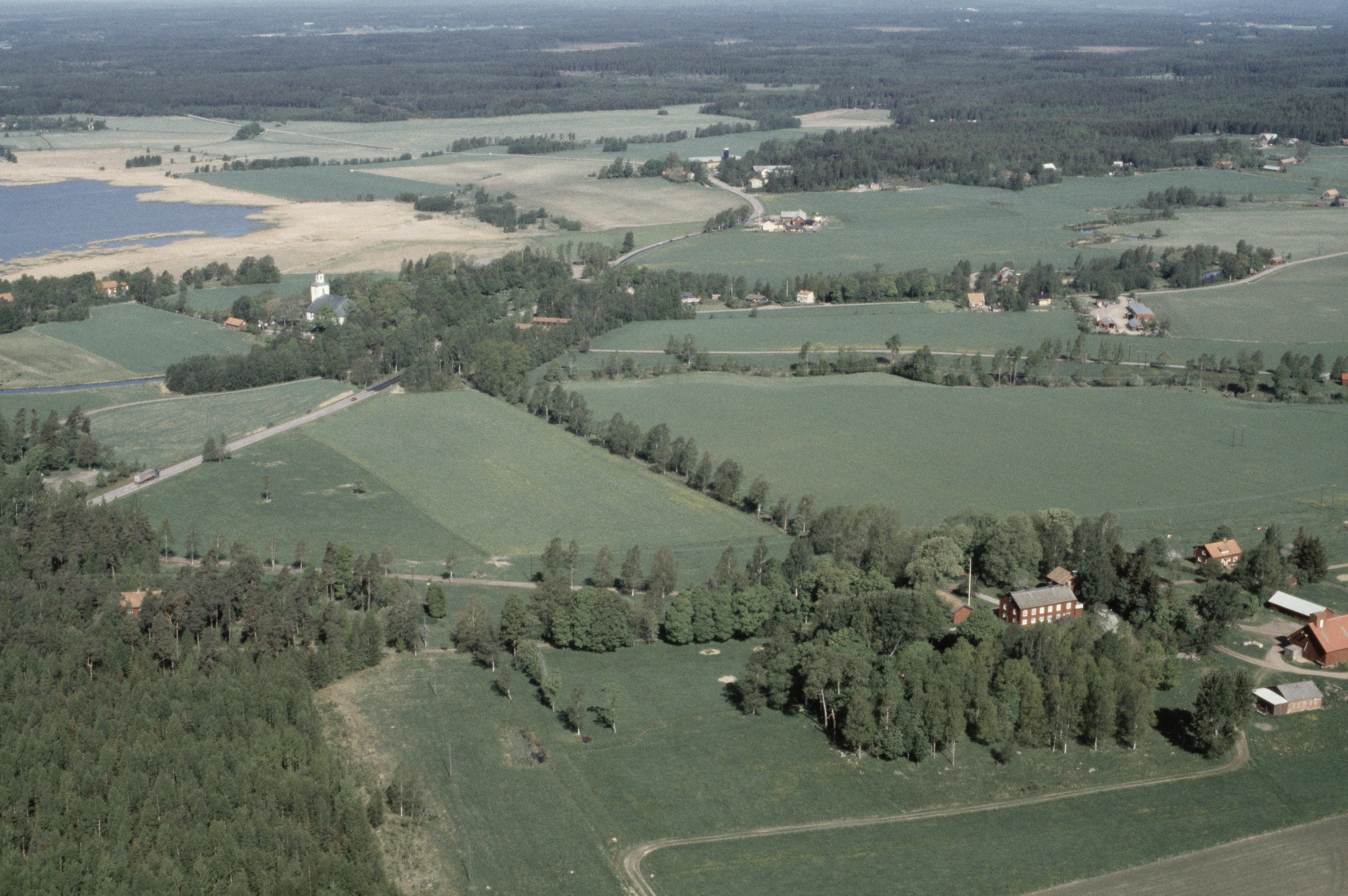 Väse prästgård nere till höger. Till vänster om bildens mitt Väse kyrka vid ån Glummans utlopp i sjön Panken. Bilden är tagen mot (väderstreck): NV
