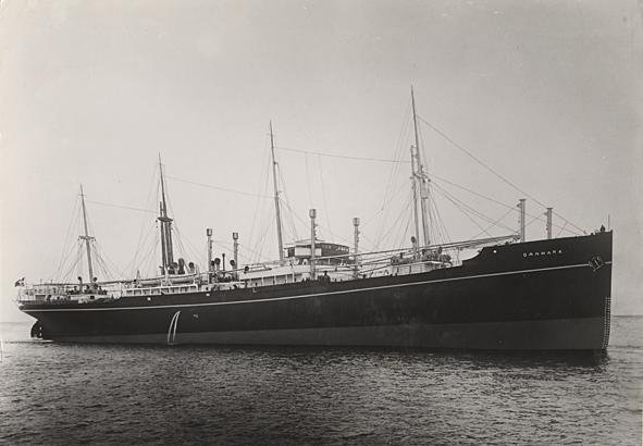 Foto i svartvitt visande lastmotorfartyget "DANMARK" av Köpenhamn, vid kaj i Köpenhamn under 1939-40.
