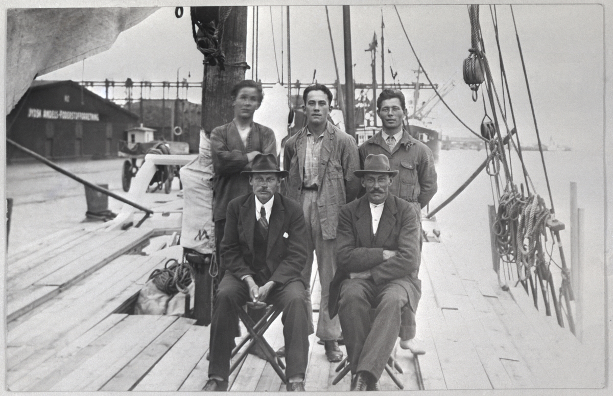 Besättningen på 3 msk. Falken från Pukavik. Stående fr.v. kocken Erik Eriksson, Gustavstorp, jungman Erik Bergström, Ternö, lättmatros Hanssen, Danmark, sittande skepparen Hjalmar Johanson och broderen bästeman Emil Johansson.