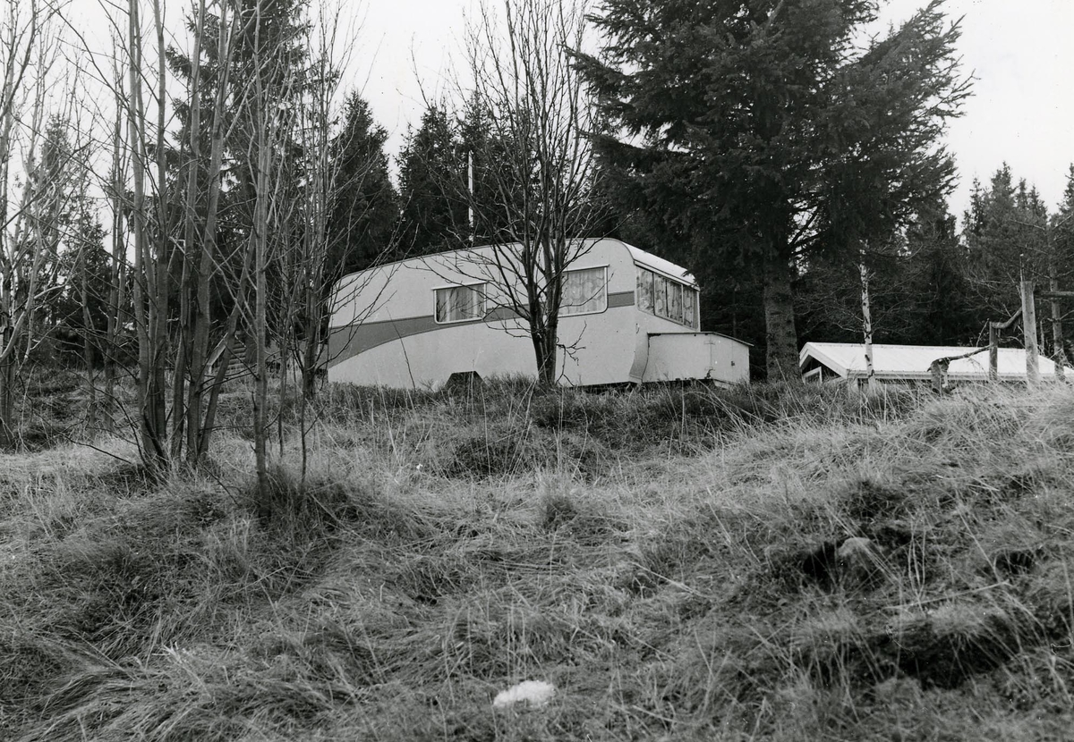 Ångermanland, Trysunda. Inkomster från sommargäster blir en allt viktigare faktor i fiskarenas ekonomi. Här har en av hamnborna kringgått byggnadsförbudet och ställt upp en husvagn som uthyrs som sommarstuga.