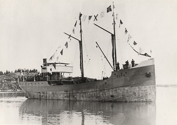 Foto av ångfartyg förankrat i stilla vatten. Signalflaggor hissade över topparna.