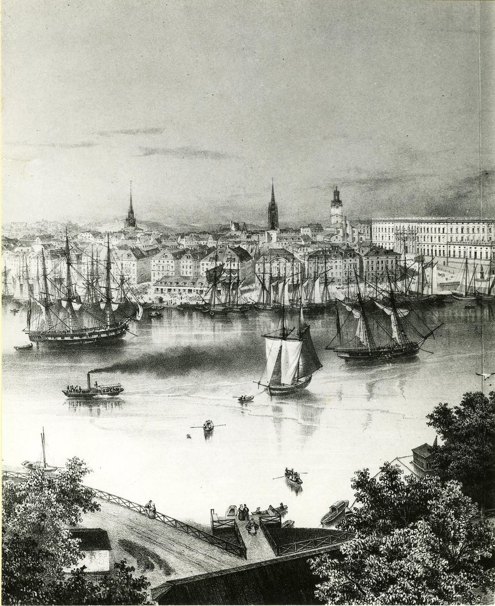 Utsikt mot Skeppsbron från Skeppsholmskyrkan, efter stick av C.J. Billmark på 1850-talet.