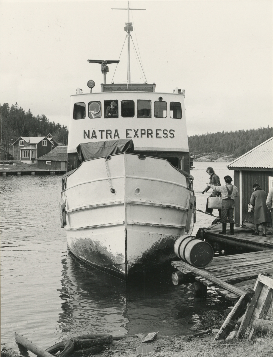 Nätra Express vid Konsums brygga. Fiskaren Ola Lundgren hjälper passagerare ombord