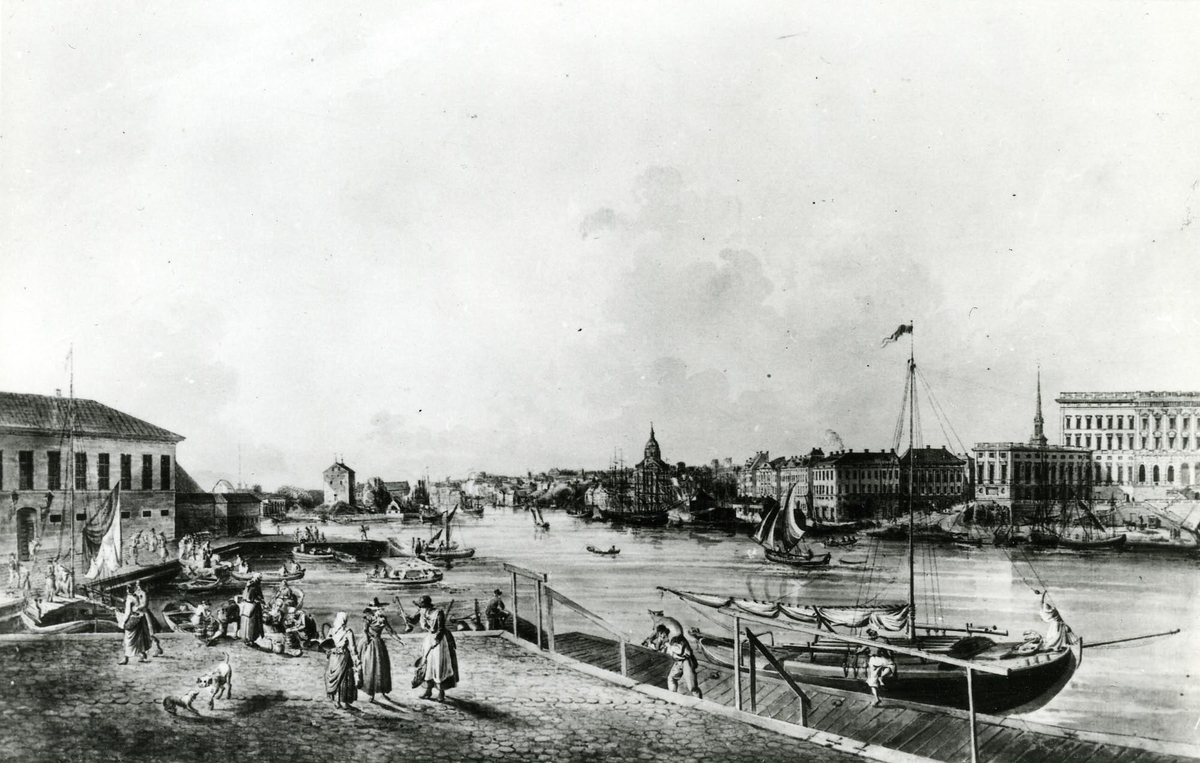 Stockholm åt Saltsjön sett i trakten av gamla arsenalen 1700-talets slut. Blasieholmshamnen.