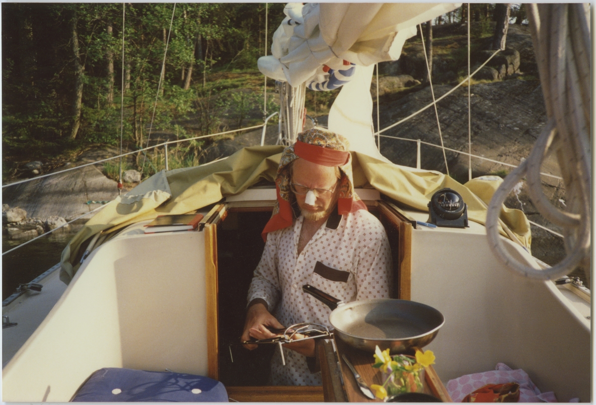 IF-båtliv; Man lagar mat i IF-båt. Enl. givaren: "Nämndöskärgården. Stark sol väl skyddad kock"